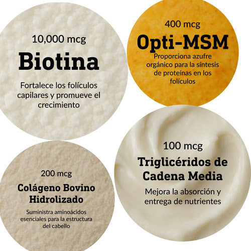 - Biotina + Zinc: Vitales para el crecimiento y fortalecimiento del cabello.